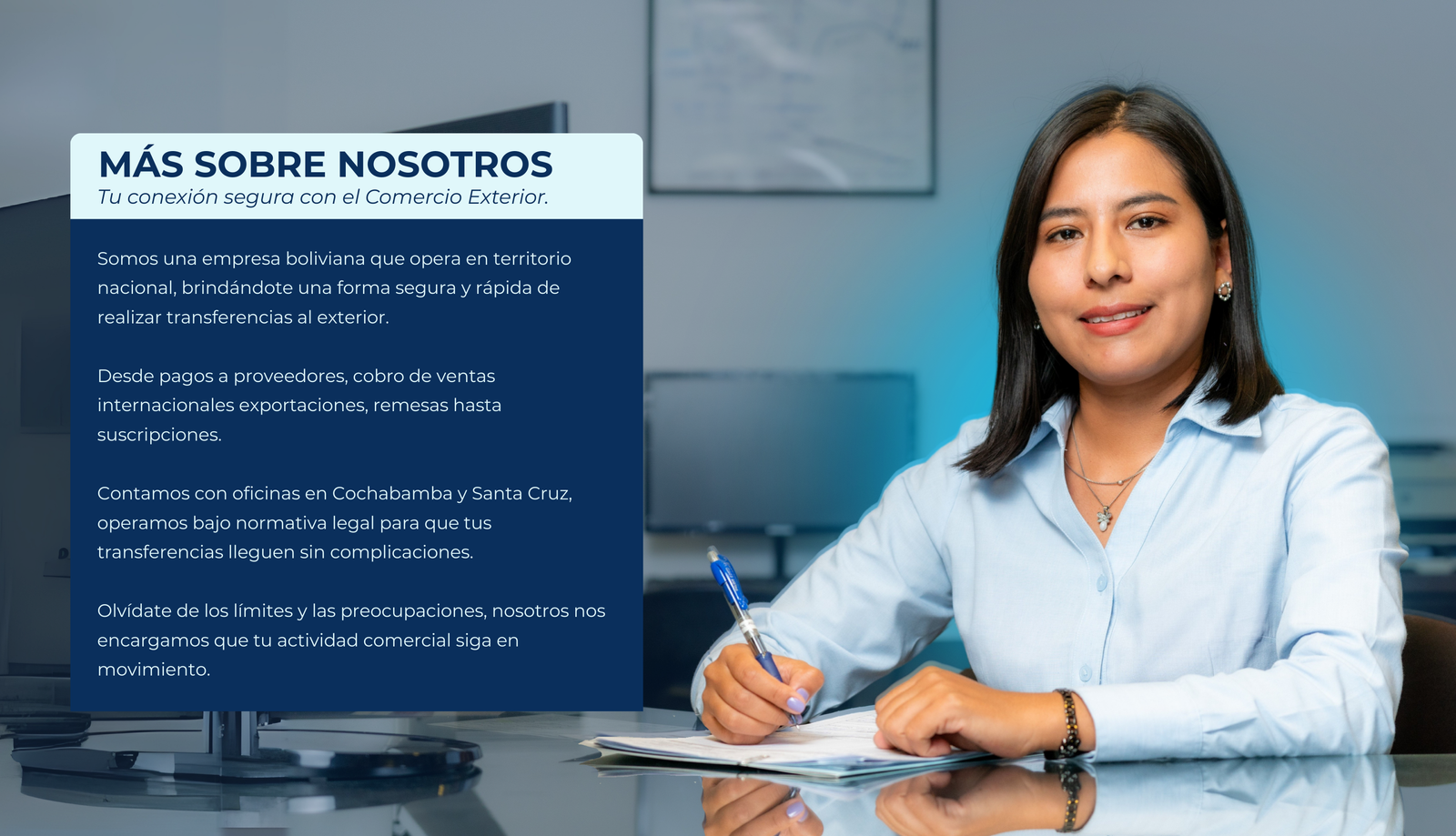 Realizamos transferencias en dólares, euros y soles para pagos a proveedores en el exterior, entrega en DÓLARES en Bolivia a exportadores por cobro de ventas internacionales y remesas a cualquier parte del mundo.